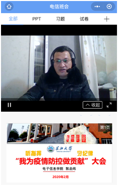 最后,郭启炜针对近期工作提出具体要求,一是要落实每日上报制度,特别是“四类”人员情况,全体同学不得瞒报、漏报信息。二是学生要提前转换频道,做好线上学习准备和开展自主学习,保质保量完成学习任务,安排好居家学习生活。三是学生要了解利用“雨课堂”开展在线教学重点,从课前、课中、课后三个方面对学生网上学习提出要求。