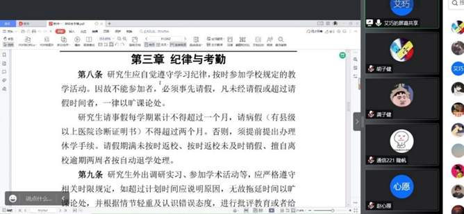 最后,2020级研究生艾巧为大家进行了思想道德及心理健康教育、网络诈骗安全教育、疫情防控安全教育,结合日常研究生生活案例,希望全体研究生新生能够总结经验、汲取教训,并对此次会议进行了总结。本次研究生新生入学教育,旨在抓住新生入学的关键时期,鼓励全体新生以新面貌开启研究生生涯的新篇章。