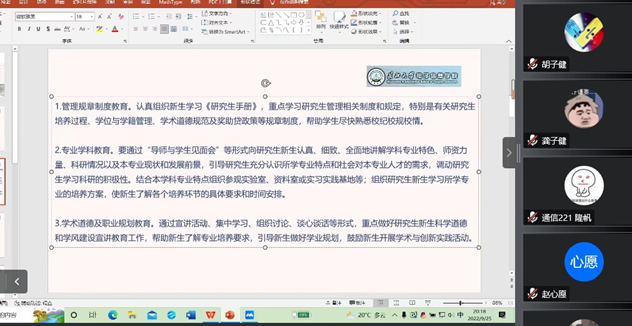 (通讯员:王迎盈)9月25日晚上八点,为了引导和教育新生更快更好地融入新阶段的学习和生活,我院召开了2022级研究生新生入学教育,基于疫情防控等原因考虑,本次会议线上举行,未返校的同学通过腾讯会议同步参会。出席本次班会的有辅导员康玮,2020级研究生学姐艾巧,2020级研究生学长李问周以及全体2022级研究生新生。会议由艾巧主持。