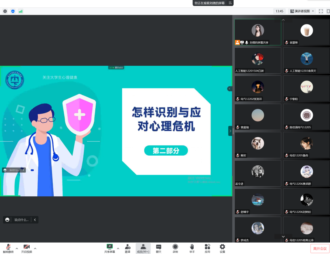 心理健康教育是促进学生身心健康、塑造健全人格品质,有效培养担当民族复兴大任时代新人的重要环节和有效途径。近年来,大学生由于心理问题导致的危机事件频频发生,引导大学生关注自身心理健康已迫在眉睫。而新生入学之初,会出现各种适应方面的困惑,对于心理健康与心理咨询也存在着一定误解。因此,11月11日晚上7点,电子信息学院针对全体新生骨干开展心理健康教育培训,培训于新风公寓学工办党员活动室进行线上线下同步开展,以给学生接种心理疫苗,对于可能出现的心理困惑有所准备,指导新生骨干掌握识别与应对心理危机的技能为目的,为我院心理健康教育的推进提供有效帮助。