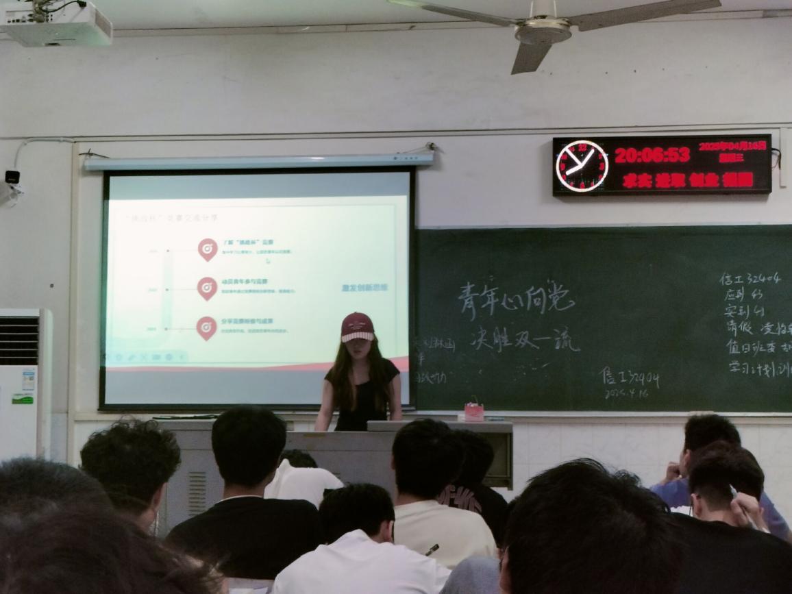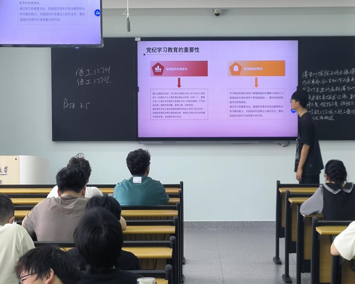 信工32404团支部于4月16日在西校区5教315教室举行四月班团会。团支书为同学们详细介绍了“挑战杯”竞赛的相关内容,鼓励同学们积极参与,以创新思维和团队协作精神,在竞赛中锻炼自己,为学校和班级争得荣誉,激发了同学们浓厚的兴趣和参与热情。随后,在团史学习环节,主持人带领同学们回顾了中国共产主义青年团自成立以来的光辉历程,深刻阐述了中国共青团在党的领导下,为国家独立、民族解放和社会主义建设所做出的卓越贡献。同学们认真聆听,深刻感悟到中国共青团与时代同呼吸、与祖国共命运的使命担当,进一步增强了作为共青团员的光荣感和责任感。