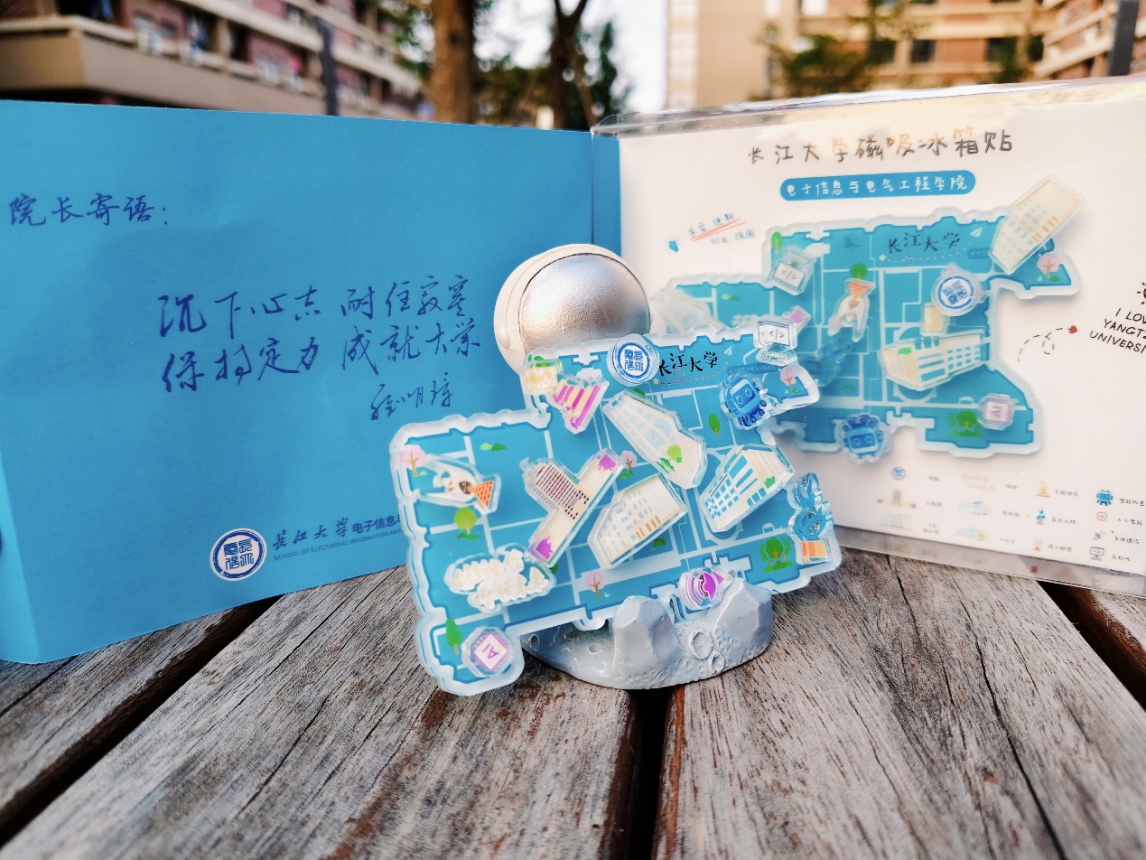 学院精心设计、定制包含学校和学院各类元素的主题冰箱贴,将校园标志性建筑与学院特色融为一体。这份兼具纪念意义与实用价值的礼物,寄托着"常回家看看"的深情期盼。其间还印刻着院长的寄语:沉下心志、耐住寂寞,保持定力、成就大业,字里行间寄托了对毕业生的深情厚望。