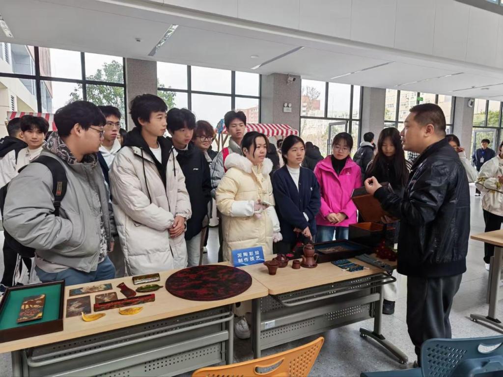 现场,红白相间的木质摊位一字排开,瞬间将现代化的教学楼长廊变身为烟火气十足的“非遗市集”。葫芦镶嵌彩绘烙画、荆楚茶道、荆楚拓彩、楚汉帛画、荆州竹雕、微型风筝……这些听起来颇具年代感的技艺,此刻正伴随着年轻人的笑声和惊叹“活”了过来。