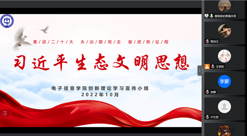 (通讯员 曾诗玉)为深入学习贯彻习近平新时代中国特色社会主义思想,引导同学们喜迎二十大,奋进新征程,同时更好地宣传学习小组的学习成果,电子信息学院学生创新理论学习宣传小组于10月9日下午通过线上方式连续展开创新理论学习小组宣讲活动。主讲人为校青马班学员、我院学生创新理论学习宣传小组成员黄婉亭,辅导员李蒙、信卓12101班团支部、人工智能12103团支部全体同学参会。