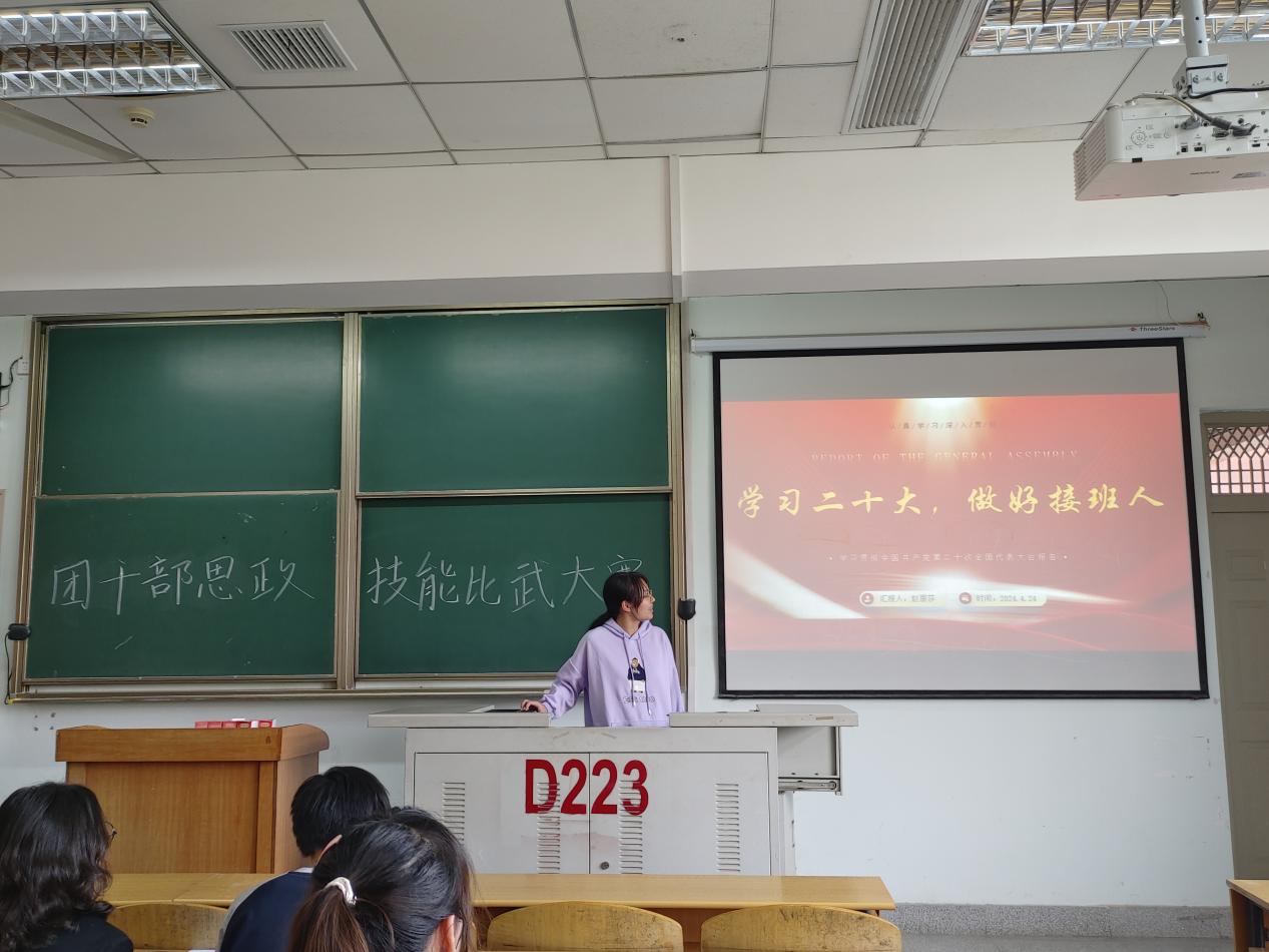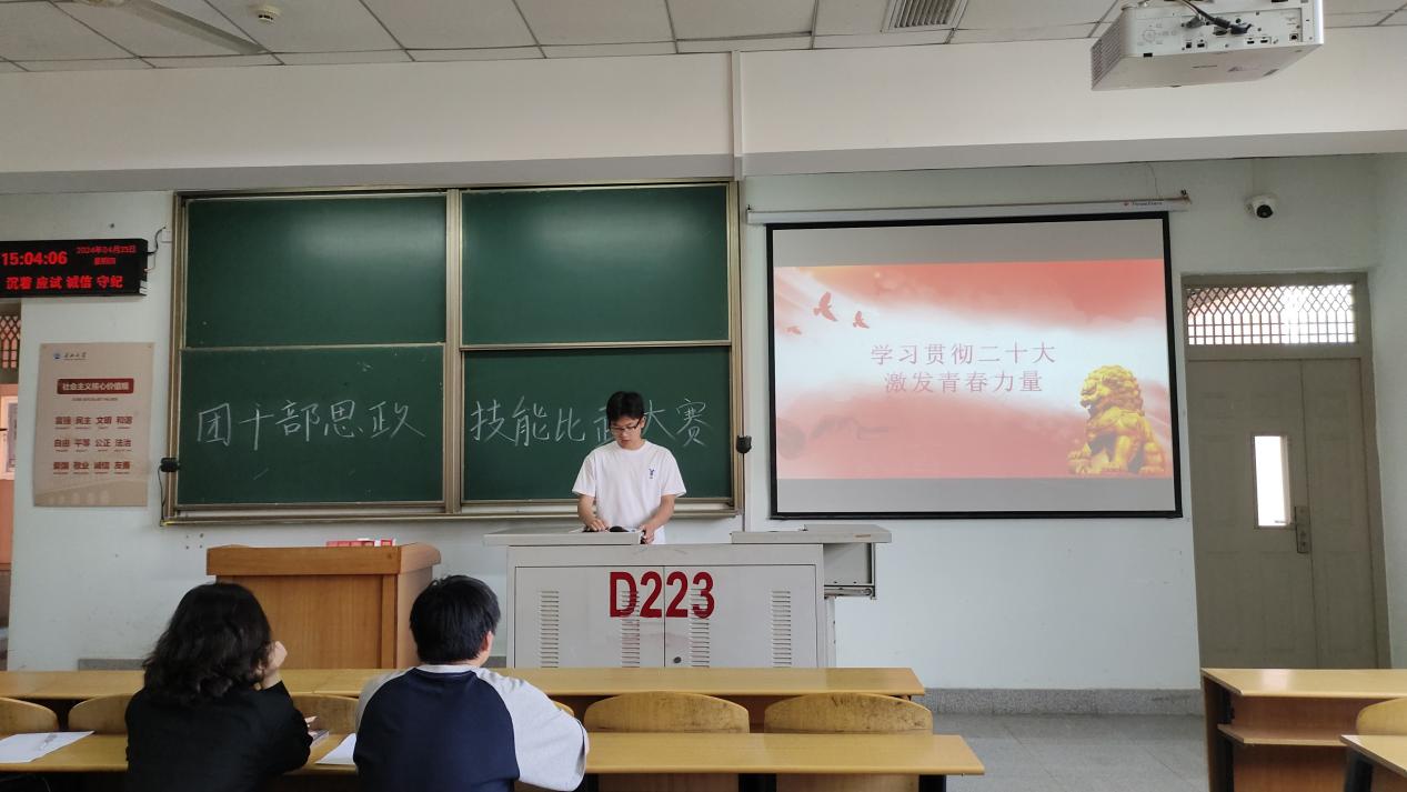 本次基层团干部专项赛要求2022级、2023级各班团支部派一名及以上学生干部参加,2020级和2021级各班团支部自愿报名参加。本次竞赛包含理论知识竞赛和主题团课展示两部分,其中理论知识竞赛为线下闭卷答题,题型包括选择题、填空题;主题团课展示要求参赛选手依据《团干部思政技能大比武主题团课备赛指南》,紧扣“学习贯彻党的二十大精神”主题,以PPT形式展示一节主题团课。两部分各占总成绩的50%,最后电信类12302班牛宇蒙同学以9.4分的综合成绩获得本次基层团干部思政技能大比武的第一名。