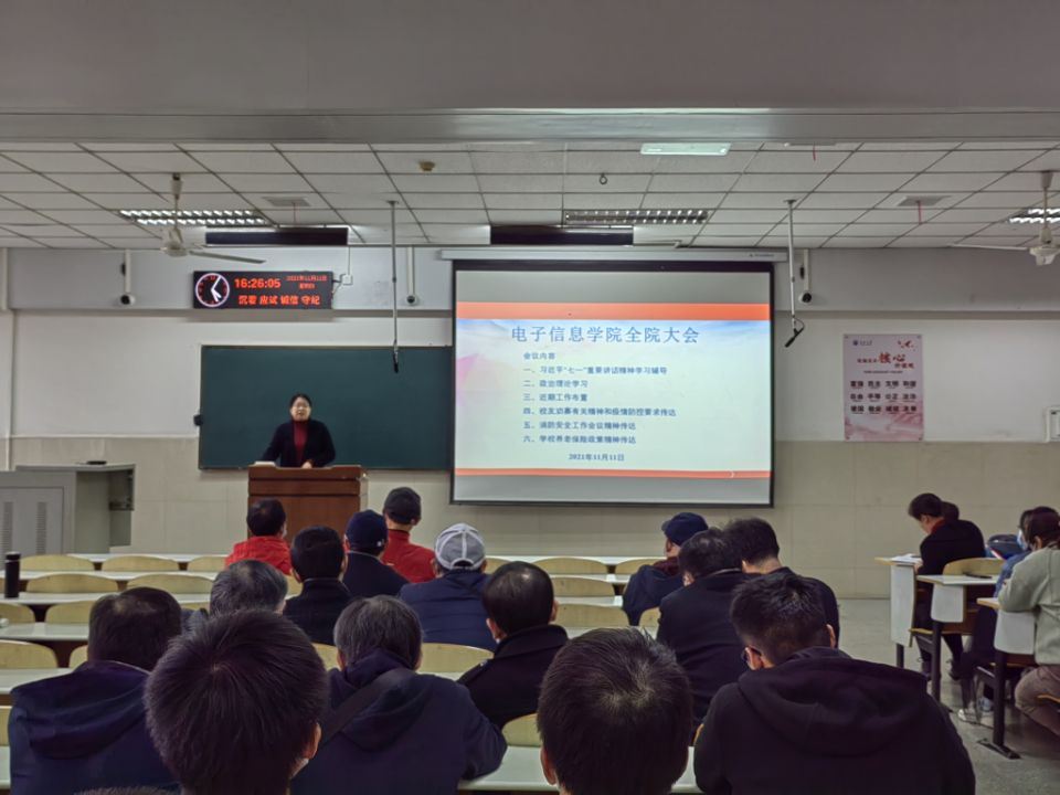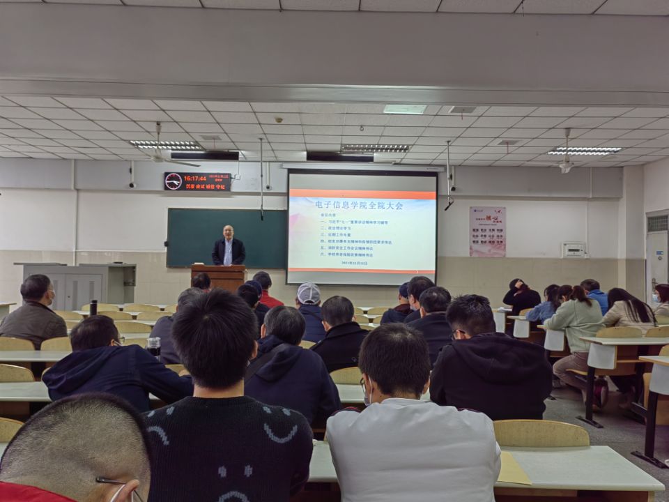 (通讯员 胡桐/文 胡桐、滕亚楠/摄)为了深入学习领会习近平总书记“七一”重要讲话精神,同时对全体党员、预备党员以及入党积极分子进行政治理论学习培训,电子信息学院于11月11日下午14:00在长江大学东校区12教302召开全院大会组织学习习近平“七一”重要讲话精神。参加本次会议的人员除了学院全体教职工,还有全体学生党员、预备党员以及入党积极分子。大会由学院党委书记刘逸主持。