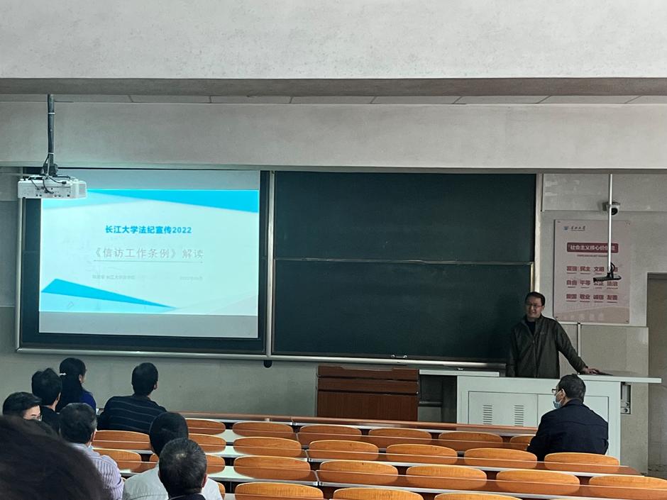 本次宣讲会邀请到长江大学纪法知识宣讲团成员、长江大学法学院硕士研究生导师、律师程爱军老师,他结合工作实际从四个方面向电信教职工解读了《信访工作条例》:信访是什么,信访的历史与定位,《信访工作条例》的主要内容与党员干部、公职人员该如何看待和处理信访工作。宣讲报告深入浅出,结合实际,向我院教职工普及了信访法律法规与相关知识。