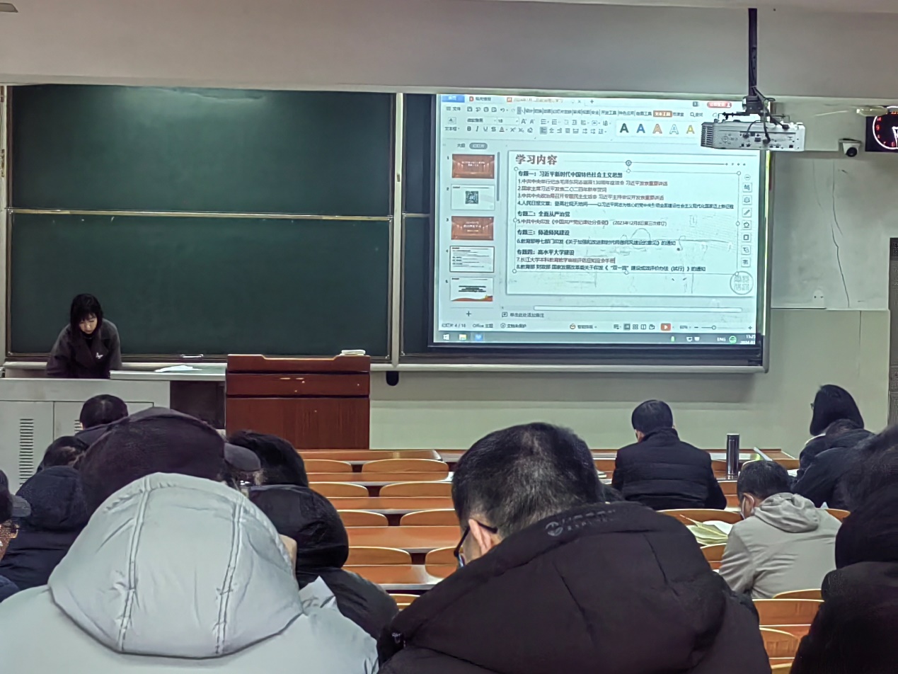 1月15日下午,学院在主教107召开教职工大会,张晨露副书记带领全体教师开展政治理论学习。会上全体教师一同学习了习近平总书记在纪念毛泽东同志诞辰130周年座谈会上的重要讲话,国家主席习近平发表二〇二四年新年贺词,习近平总书记在中共中央政治局专题民主生活会上的重要讲话,及中共中央印发的《中国共产党纪律处分条例》,还学习了长江大学本科教育教学审核评估应知应会手册。