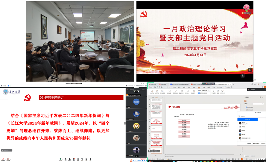 学院各党支部也于1月18日前按要求开展了本月主题党日活动,并在会上进行了2023年度民主评议党员。全体党员一起重温入党誓词,交纳党费,诵读党章。集体学习后,支部党员开展“讲微党课”活动,并后结合《国家主席习近平发表二〇二四年新年贺词》与《长江大学2024年新年献词》,展望2024年。支部党员认真总结了2023年的学习工作和生活,并严肃开展了批评与自我批评。