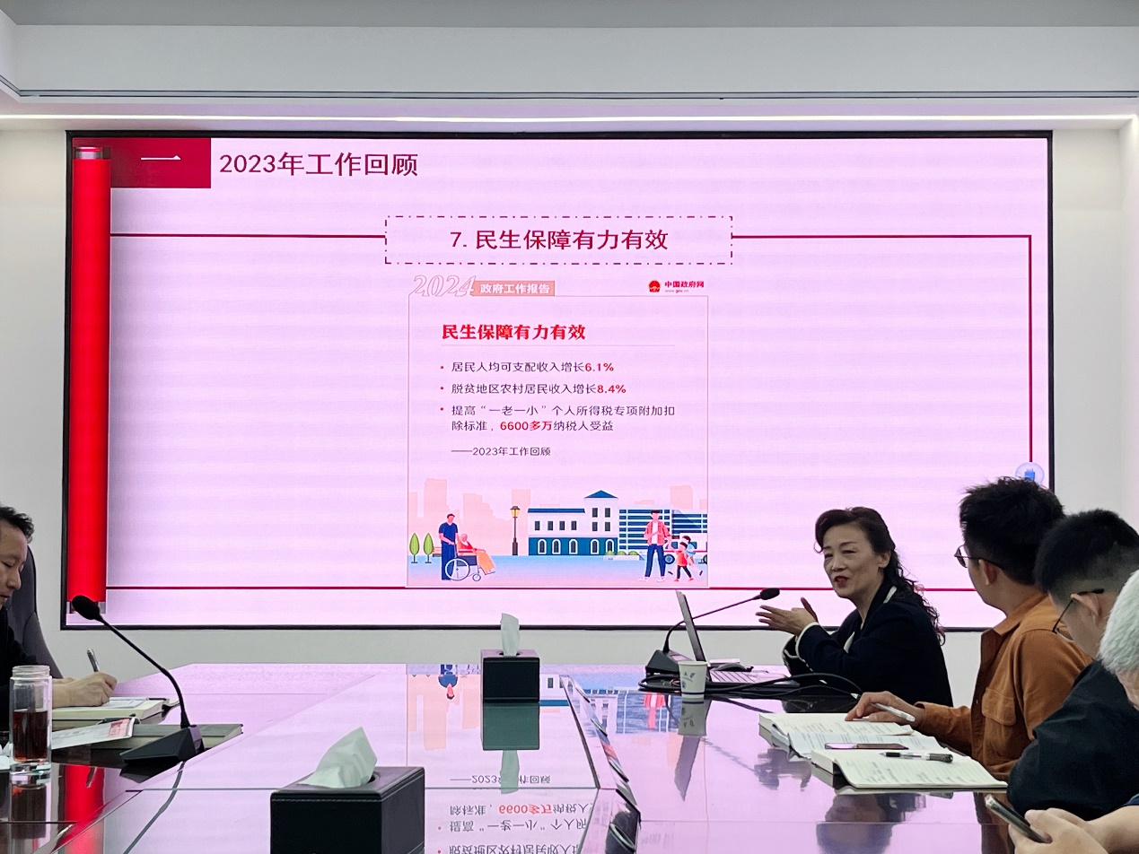 贾廷秀教授以“团结凝聚力量 奋斗铸就伟业”为题开展深入学习领会全国两会精神专题宣讲。宣讲会上,贾廷秀教授围绕2023年的工作回顾、2024年经济社会发展的总体要求和政策取向以及2024年政府工作任务3个方面,数字化、全景式、多维度解读了全国两会精神;她还重点介绍了全国两会关于科教兴国的有关要求,结合学院的学科专业特点,解读了新质生产力的内涵。整场授课主题鲜明、层次清晰、内容丰富,具有很强的政治性、思想性和启发性。院长罗明璋表示,贾廷秀教授的宣讲给我们启发很大,我们要深入学习领会全国两会精神,力争在推进现代化产业体系建设、发展新质生产力的过程中做出电信学院应有的贡献。
