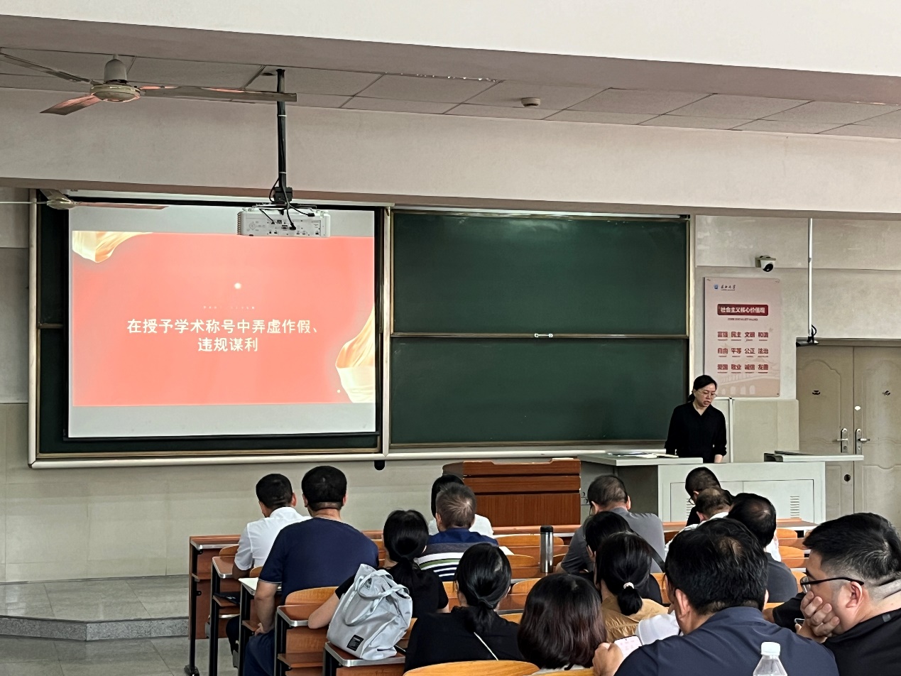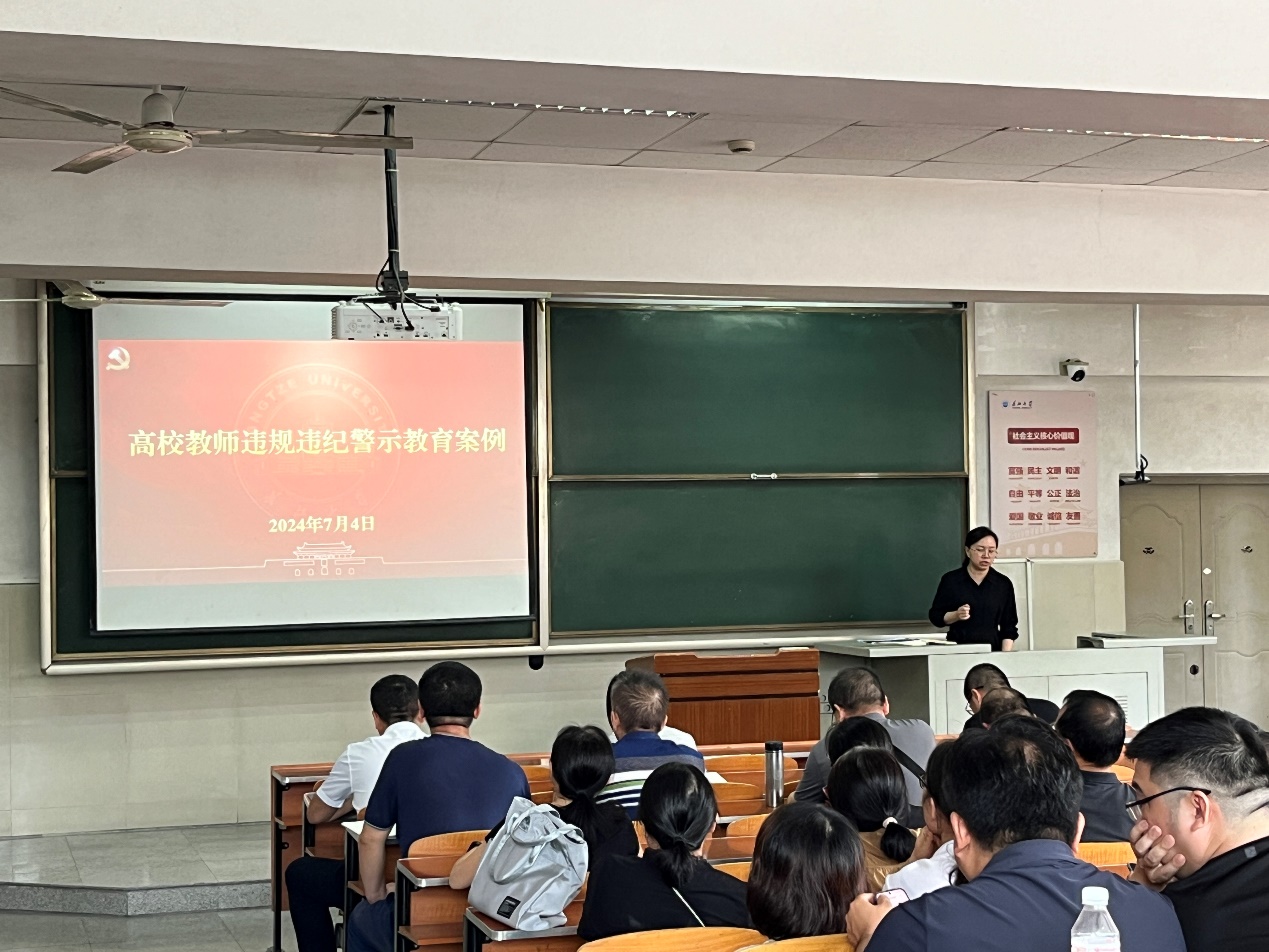 学习结束后,郭梅做了警示教育典型案例剖析。她介绍了教育部公布的高校教师违规违纪的警示教育案例,主要涉及违背党的路线、方针和政策,违规套用科研经费,违规收受礼品礼金,违反组织工作纪律,泄露国家机密,违反师德师风,学术不端问题,违规进行评审请托等方面,警示老师们坚守教育初心,做到以德立身、以德立学、以德施教。