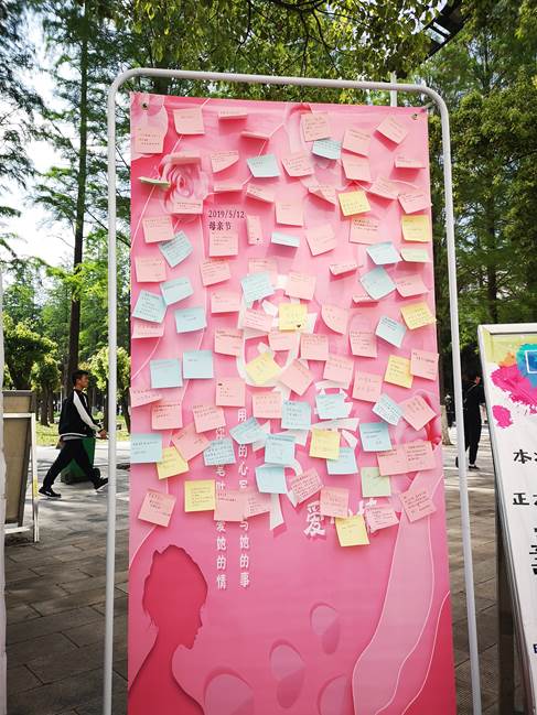 活动期间,超过500位同学积极参与进来。同学们在摆点处登记信息,领取信封,同时还领取了一份小礼物,摆点处前经常站满了等待参与活动的同学。接着同学们私下在信纸上写下平日未能对母亲说出的感恩的话语,将这些话封于信封里,于5月10日前投入信箱,然后由电子信息学生会组织部在活动结束后对信进行整理后将他们的感恩之语全部寄送出去。在摆点处旁还立着一面爱心墙,爱心墙上承载了同学们对母亲的思念与祝福,满满的便利贴陈述着他们满满的爱。