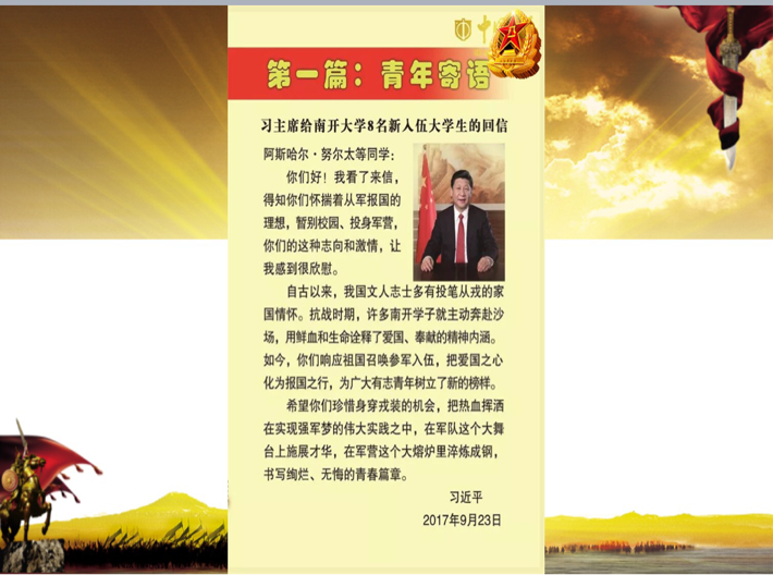 本次活动,主持人从青年寄语、条件标准、应征指南、优待政策、成长经历等五个方面向同学们介绍了征兵工作的相关政策和内容。青年寄语的视频使同学们体会到自身国服责任和义务。条件标准从政治条件、身体条件、年龄条件对同学们参军加以要求。应征指南展示了相关报名流程。优待政策更是为有职业和学业规划的同学们参军注入一支强心剂。