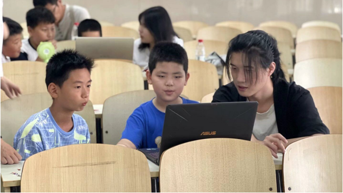 图为“愿益”团队成员教授小朋友们创意编程