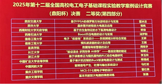 2025年5月16日至17日,第十二届全国高校电工电子基础课程实验教学案例设计竞赛(鼎阳杯)决赛在哈尔滨工程大学举行,经过激烈角逐,我院杨顺辽和陈英芝老师团队以实验案例《“验设混合 求同存异AI伴学”——叠加定理的验证》斩获全国决赛二等奖。